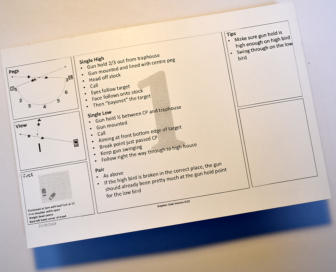 These started as another way of presenting the imagery script. I wondered if it was possible to condense the 7 sides of A4 text into a set of 6x4 cards - one for each shooting station. Each card would contain all the information required for each station (e.g. foot position, gun hold, break points etc) - all on a standard format 6x4 index card. Then during practice, I could just use the relevant card as I got to that station - a sort of memory aid. If I found anything needed to be tweaked, I could make the notes on the card and update them over a period of time.